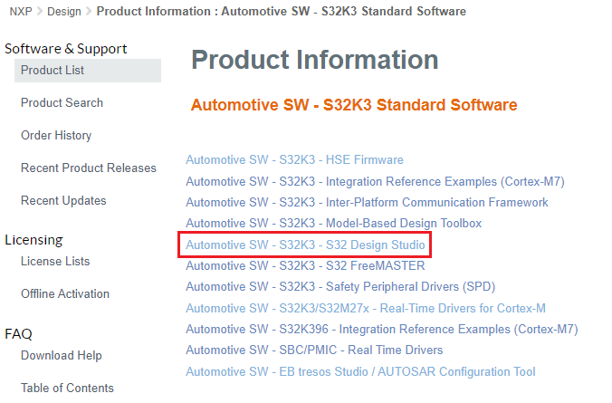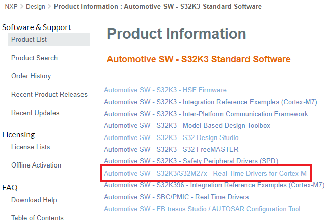 [Automotive SW(車載SW)]→[S32K3 Standard Software(S32K3標準ソフトウェア)]→[Automotive SW(車載SW)]→[S32K3]→[Real-Time Driver for Cortex-M(Cortex-M向けリアルタイム・ドライバ)]→[S32K3 Real-Time Drivers Version 2.0.1(S32K3リアルタイム・ドライバ、バージョン2.0.1)]→ SW32K3_RTD_4.4_2.0.1_DS_updatesite_D2207.zip