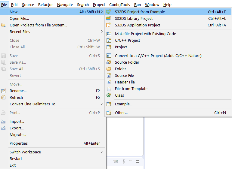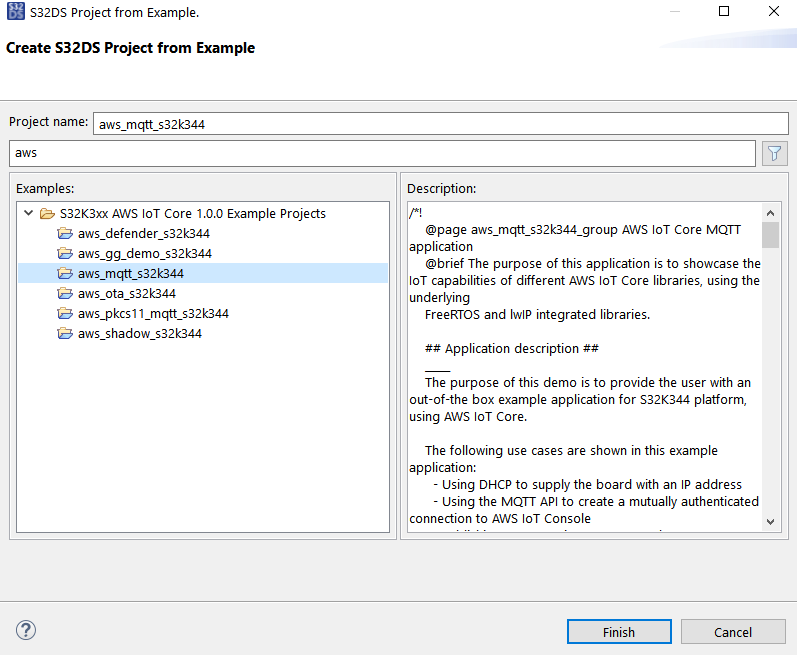 S32 Design Studioを開いたら、[File(ファイル)]→[New S32DS Project From Example(サンプルに基づいた新規S32DSプロジェクト)]の順に進み、aws_mqtt_s32k344 (検索ボックスにawsと入力して検索可能)を選択します。[Finish(完了)]をクリックします。