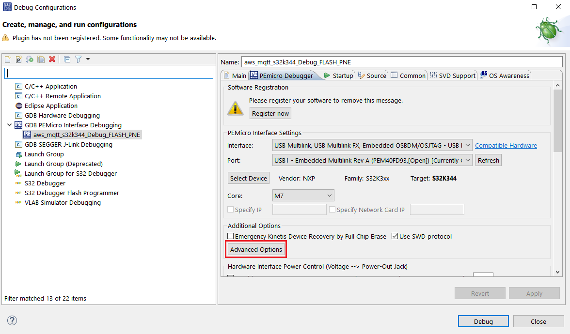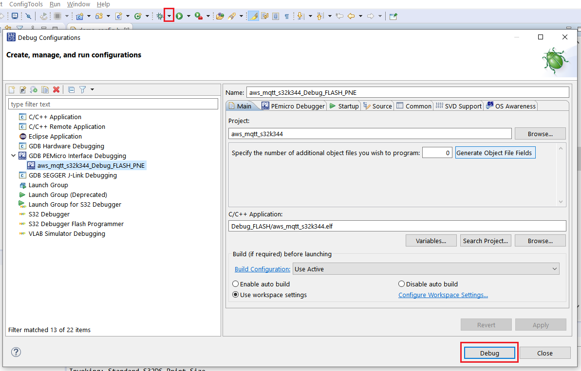 S32 DSの[Debug(デバッグ)]ボタンに対応する下向き矢印をクリックし、[Debug Configurations...(デバッグの構成)]を選択します。aws_mqtt_s32k344_Debug_FLASH_PNEを選択し、[Debug(デバッグ)]ボタンをクリックします。