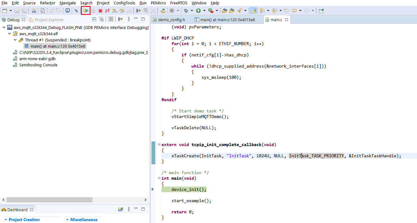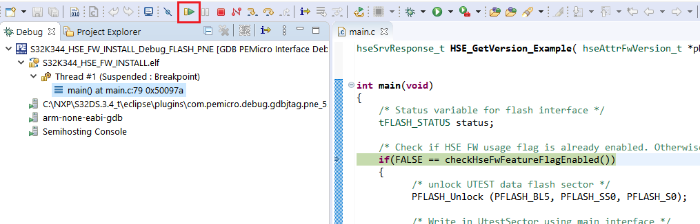 「Run the demo(デモの実行)」セクションに示すようにプロジェクトを実行すると、S32 Design Studioに組み込まれているデバッガを使用できるようになります(例:[Resume(再開)]をクリックする前にブレークポイントを設定したり、実行を一時停止して現在実行されているコードを確認したりできます)。デバッグの詳細については、S32 Design Studioのインストール・ディレクトリにあるS32DSユーザー・ガイド(「Debugging(デバッグ)」の章)を参照してください。