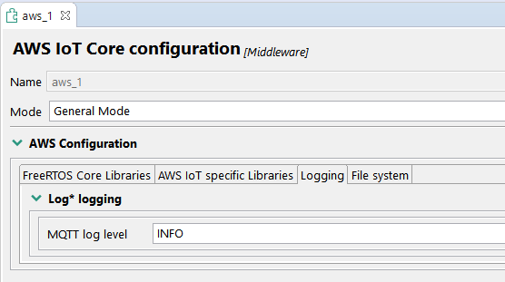 ロギング・レベルは、[Peripherals(ペリフェラル)]ビューで更新できます。このビューには、「Build and Run the demo(デモのビルドと実行)」セクションのステップ3で示すようにアクセスできます。ロギングの設定は、AWSコンポーネントの[Logging(ロギング)]タブにあります。