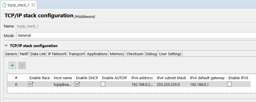 DHCPの使用を望まない場合は、[Peripherals(ペリフェラル)]ビューの[Netif]タブにある[tcpip_stackコンポーネント]で設定を変更できます。