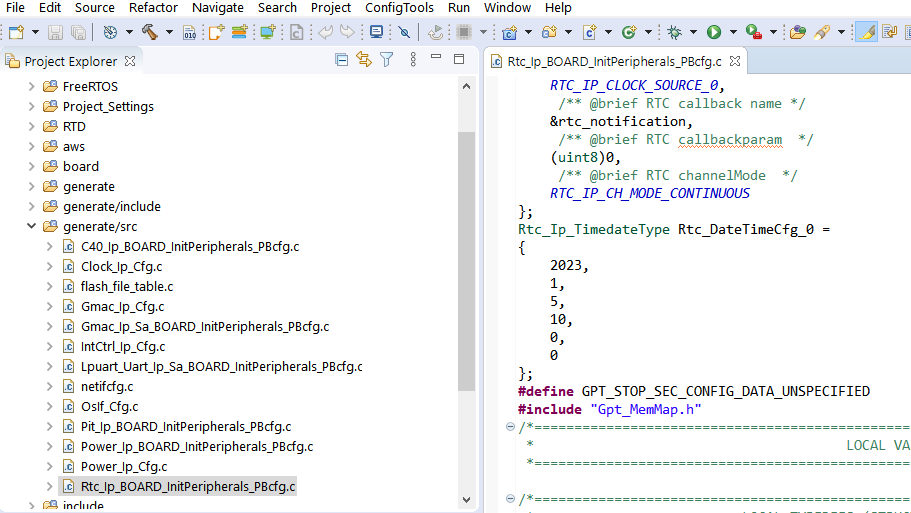 このエラーがシリアル・ログに記録されている場合は、サーバ証明書の検証に失敗している可能性があります。原因の1つとして、RTCでの現在の時刻の設定が間違っていることが考えられます。これは、generate/src/Rtc_Ip_BOARD_InitPeripherals_PBcfg.cファイルを直接変更するか、あるいは[Peripherals(ペリフェラル)]ビューで設定を更新し、[Update Code(コードの更新)]を使用してコードを生成することで更新できます。