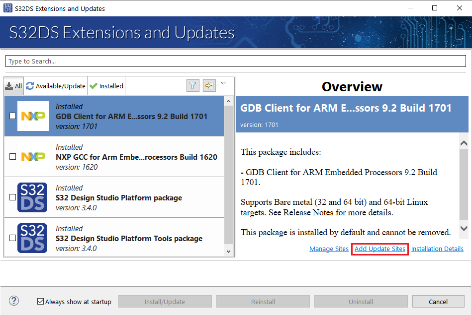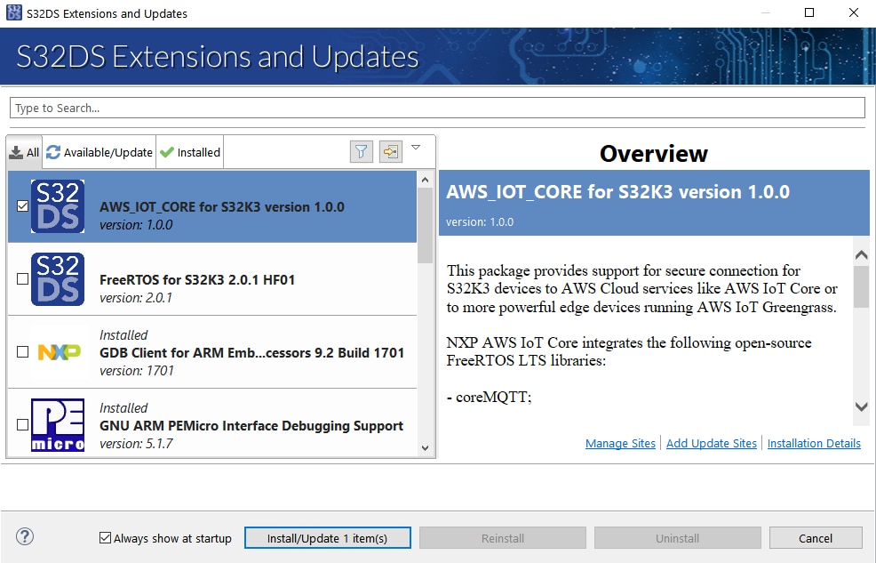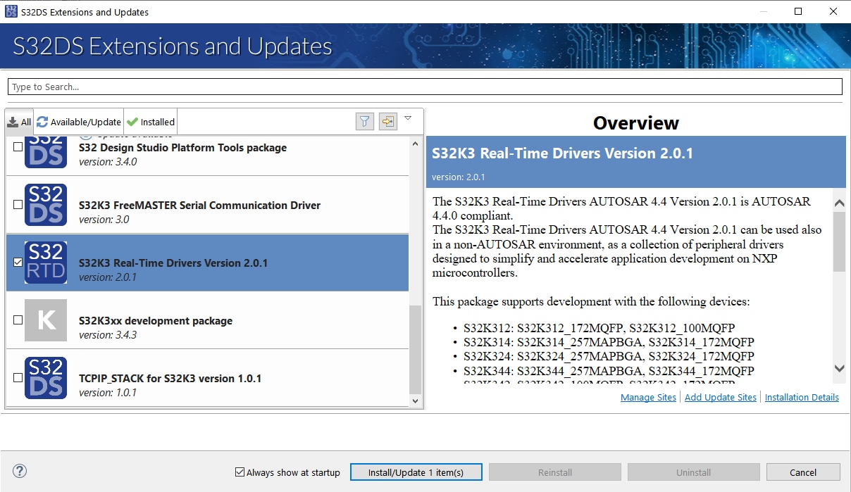 上記のソフトウェア(開発パッケージ、RTD、FreeRTOS、TCP/IP、S32K3向けAWSライブラリ)のほとんどは、S32 Design Studioの「Update Sites(更新サイト)」に.zipアーカイブ形式でダウンロードされます。これらは、次の手順に従ってS32 Design Studioにインストールできます。