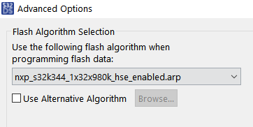注:フル・メモリ・バージョンのHSE FWを使用する場合は、次のセクションに記載されているデモ・アプリケーションのデバッグ構成を更新して、下図に示すように適切なフラッシング・アルゴリズムを選択する必要があります。