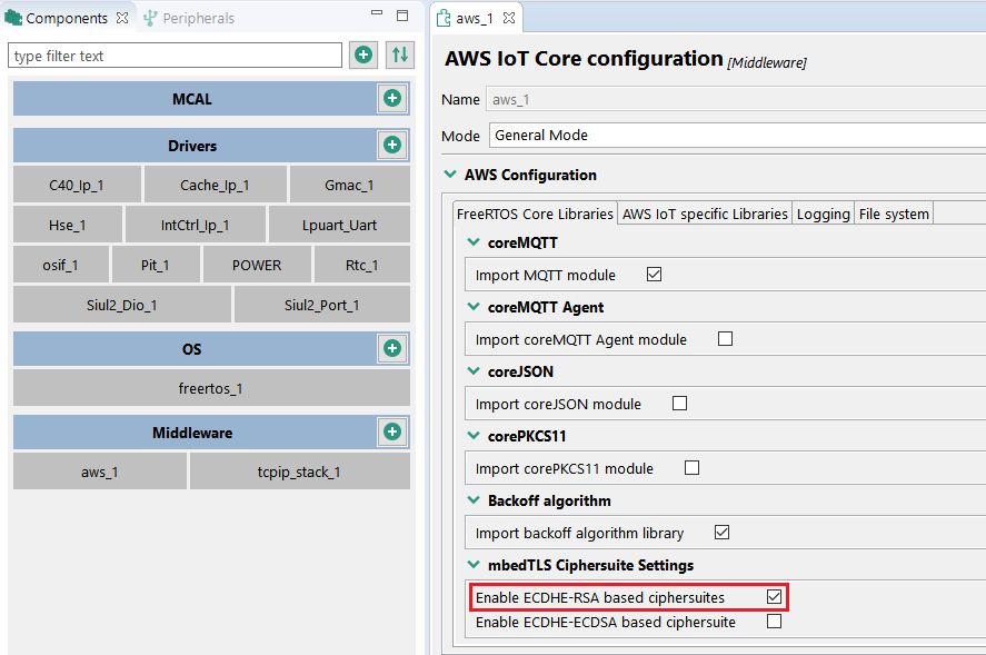 AWSコンポーネントを使用して、mbedTLSの暗号スイート設定を構成することが可能です。IoT Consoleでデフォルトとしてデバイス証明書と秘密鍵を生成する場合、それらはRSAベースになるため、次のように暗号スイートを更新する必要があります。