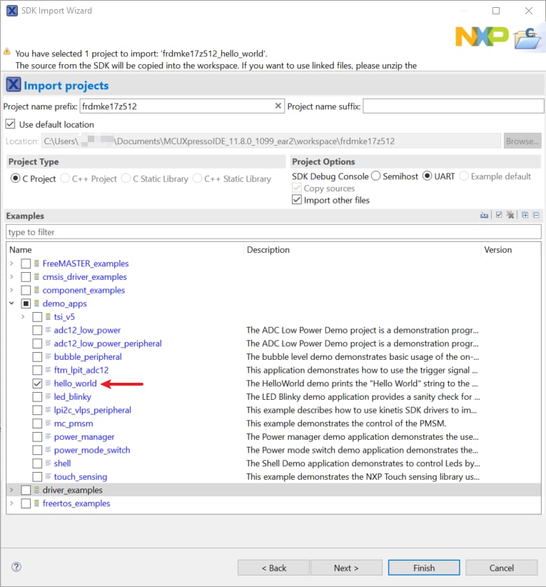 demo_appsカテゴリを展開し、led_blinkyの横にあるチェックボックスをクリックしてそれを選択します。出力用にデフォルトのセミホスティングではなくUARTを使用するには、[Project Options(プロジェクト・オプション)]にある[SDK Debug Console(SDKデバッグ・コンソール)]のチェック・ボックスで[UART]を選択します。[Finish(完了)]をクリックします 「led_blinky」プロジェクトをクリックし、前のセクションで行ったようにデモをビルド、コンパイル、および実行します