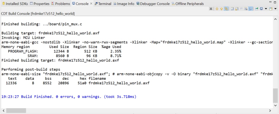 ビルドされたプロジェクトで出力されたバイナリは、デバッグ・セッションが起動する前にターゲット・ボードに書き込まれます。デバッグ・セッションでは、開発者がプロジェクトの動作を分析するのに役立つコントロールとビューが提供されます。次の手順では、FRDM評価キットを正常に書き込み、プログラミングする方法を示します。