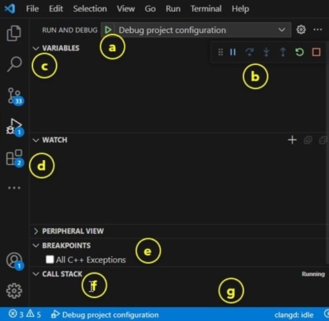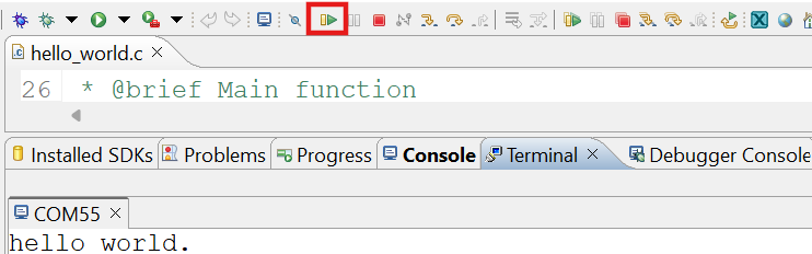 15. 画面上部の[Debug(デバッグ)]アイコンをクリックするか、「Quickstart Panel(クイックスタート・パネル)」の[Debug(デバッグ)]をクリックして、アプリケーションをボードにダウンロードします