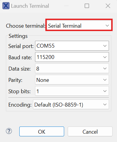 21. [Serial Terminal(シリアル・ターミナル)]を選択したら、UARTの設定をボーレート115,200、データ・サイズ8ビット、パリティなし、1ストップ・ビットに設定します。[OK]をクリックします