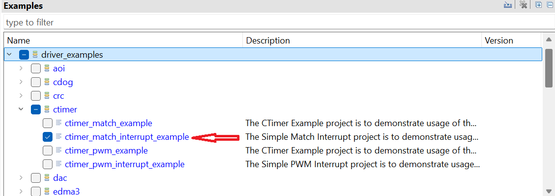 5. 矢印ボタンを使用してdriver_examplesカテゴリを展開し、次にCTimerサンプルを展開したら、ctimer_match_interrupt_exampleの横にあるチェックボックスをクリックして選択状態にします。出力用にデフォルトのセミホスティングではなくUARTを使用するには、[Project Options(プロジェクト・オプション)]にある[SDK Debug Console(SDKデバッグ・コンソール)]のチェック・ボックスで[UART]を選択します。[Finish(完了)]をクリックします