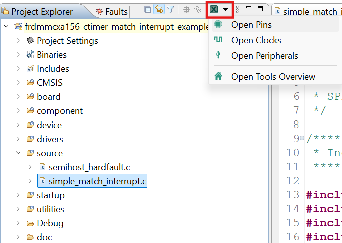 7. [Project Explorer(プロジェクト・エクスプローラ)]ビューでfrdmmcxa156_ctimer_match_interrupt_exampleプロジェクトをクリックし、前のセクションに記載されている方法でデモをビルド、コンパイル、および実行します
