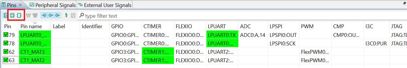 1. 以降の手順ではMCUXpresso IDEを使用しますが、サード・パーティ製IDE向け MCUXpresso Config Toolsの場合も同じ手順で実行できます。[Pins(ピン)]ビューの[Show dedicated pins(専用ピンを表示)]および[Show not routed pins(ルーティングされていないピンを表示)]のチェックボックスのチェックを外し、ルーティングされているピンのみを表示させます。ルーティングされたピンには、ピンの名称の横に緑色のボックスが表示されます。ルーティングされた各ピンに選択された機能は、緑色にハイライト表示されます