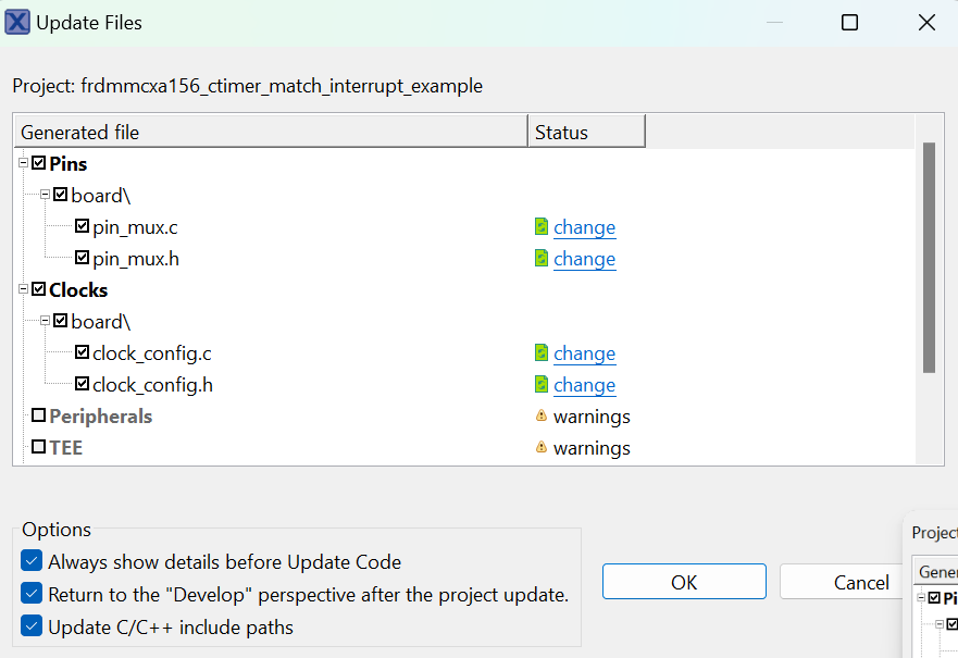 11. 次に、ピン・ツールによって生成された、新たに更新されたpin_mux.cファイルとpin_mux.hファイルをエクスポートして、これらの変更をプロジェクトに実装します。メニュー・バーの[Update Project(プロジェクトの更新)]をクリックします
