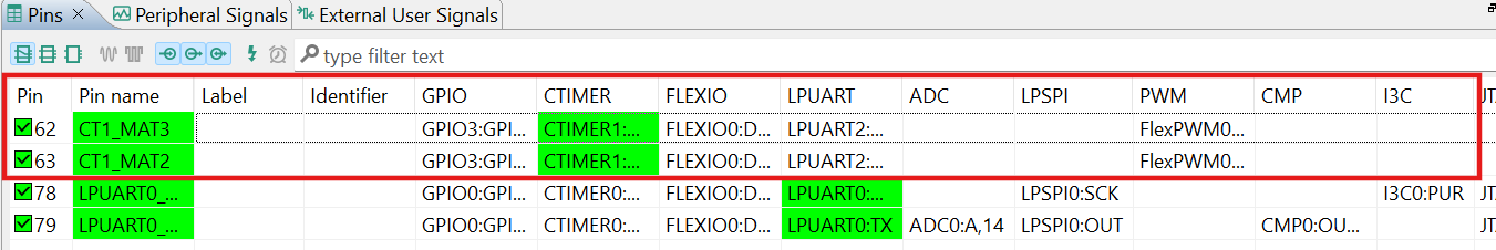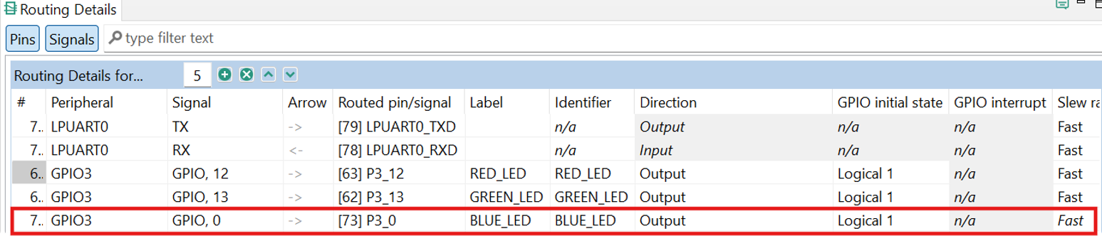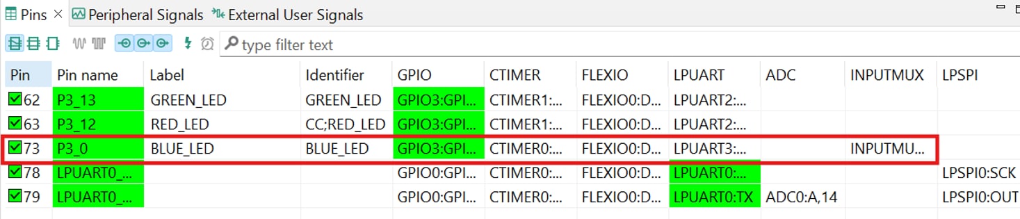 3. 現在の設定では、PIO3_12PIO3_13がCTimerの出力としてルーティングされています。ピン構成を変更して青色LEDを追加しましょう