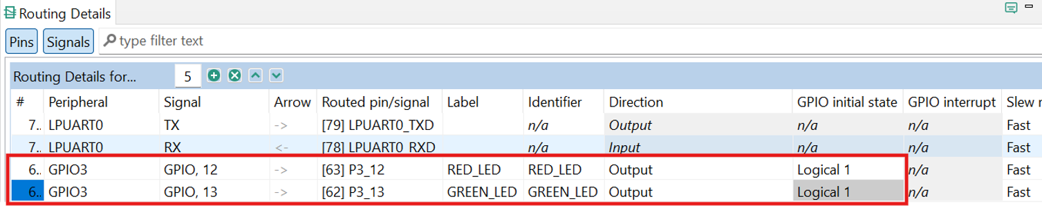 9. 次に、[Routing Details(ルーティング詳細) ]ウィンドウでGPIOピンを出力として構成します