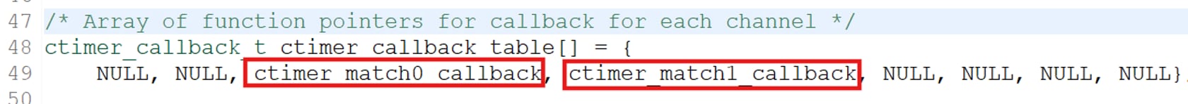 次の手順では、汎用出力の操作方法について説明します。このサンプルでは、PWM信号を生成して2つのLEDを切り替えるためのCTimerを設定します。