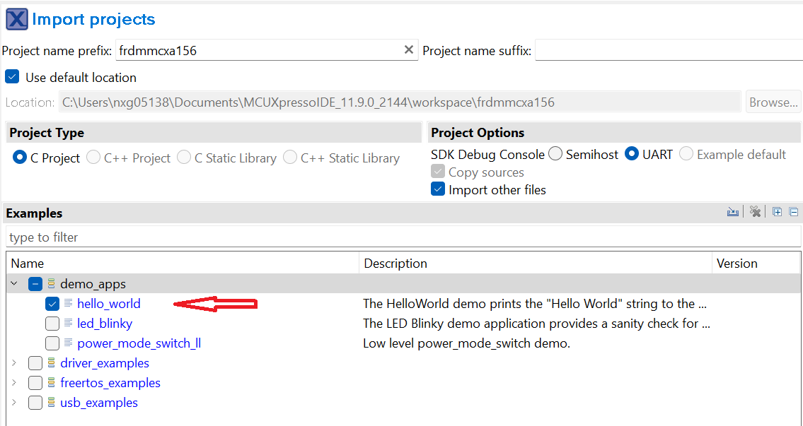7. 矢印ボタンを使用して[demo_apps]カテゴリを展開し、hello_worldの横にあるチェックボックスをクリックしてそのプロジェクトを選択します。出力用にデフォルトのセミホスティングではなくUARTを使用するには、[Project Options(プロジェクト・オプション)]にある[SDK Debug Console(SDKデバッグ・コンソール)]のチェック・ボックスで[UART]を選択します。[Finish(完了)]をクリックします
