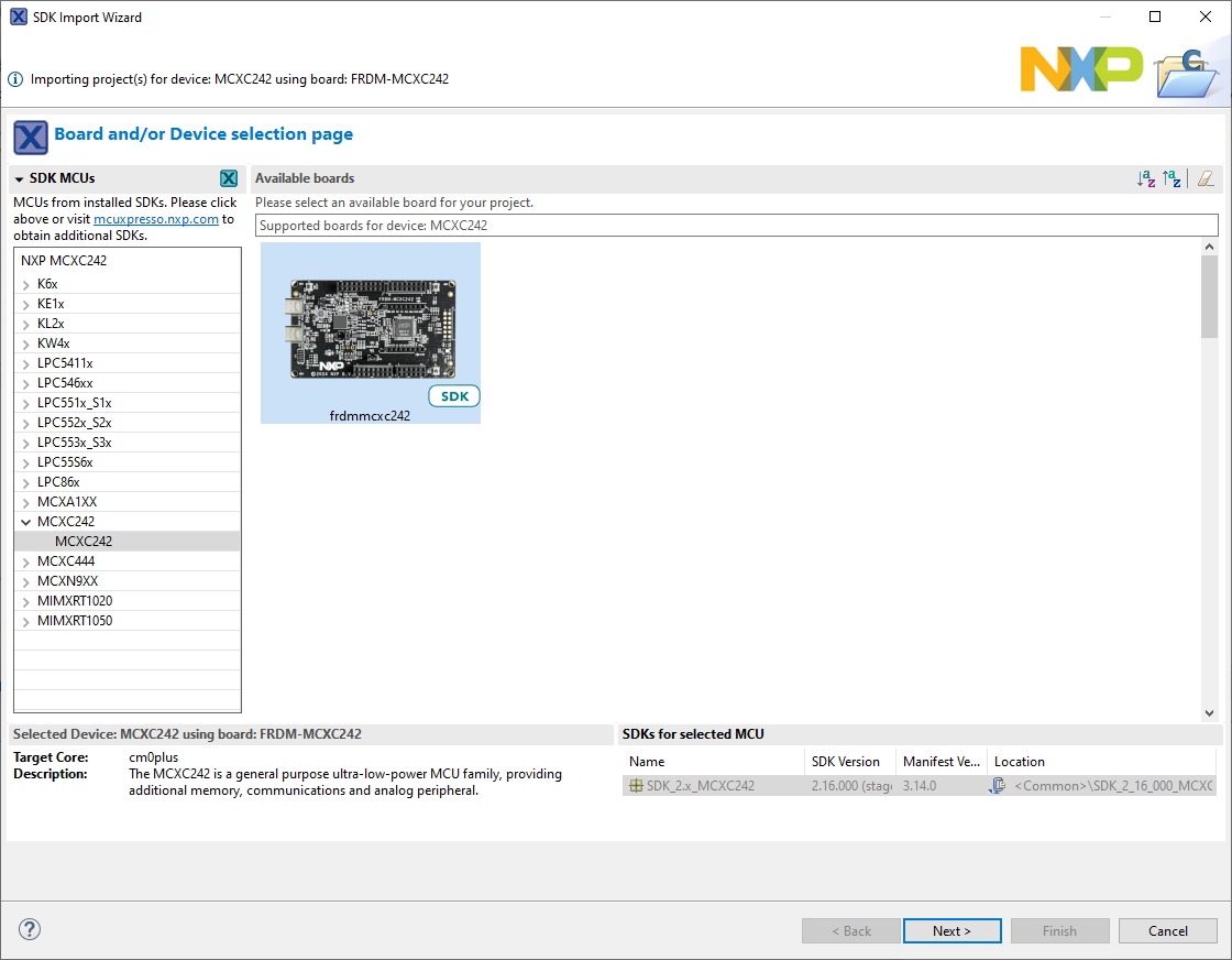 3. サンプルをインポートして実行させるボードとしてFRDM-MCXC242ボードをクリックして選択し、[Next(次へ)]をクリックします