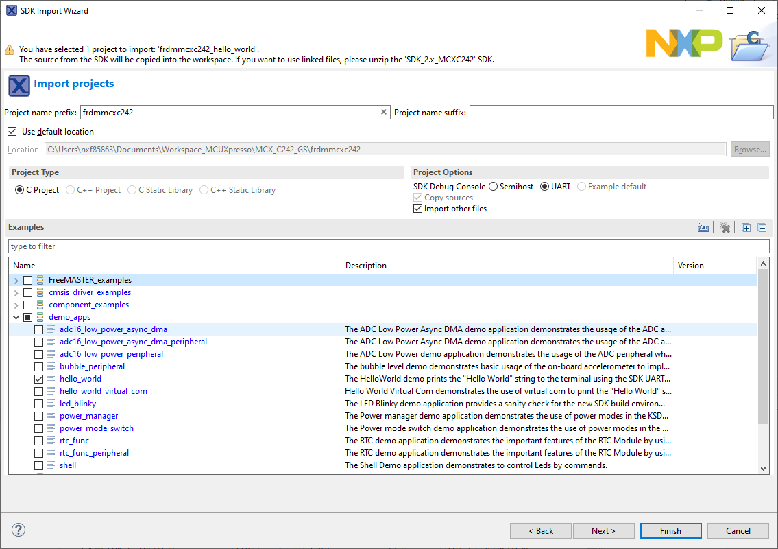 7. 矢印ボタンを使用して[demo_apps]カテゴリを展開し、hello_worldの横にあるチェックボックスをクリックしてそのプロジェクトを選択します。出力用にデフォルトのセミホスティングではなくUARTを使用するには、[Project Options(プロジェクト・オプション)]にある[SDK Debug Console(SDKデバッグ・コンソール)]のチェック・ボックスで[UART]を選択します。[Finish(完了)]をクリックします
