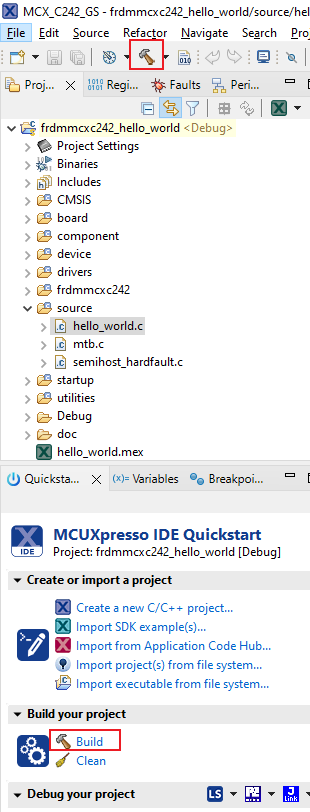 9. プロジェクトを選択し、画面上部のショートカットにある[Build(ビルド)]アイコンをクリックするか、「Quickstart Panel(クイックスタート・パネル)」の[Build(ビルド)]をクリックして、プロジェクトをビルドします
