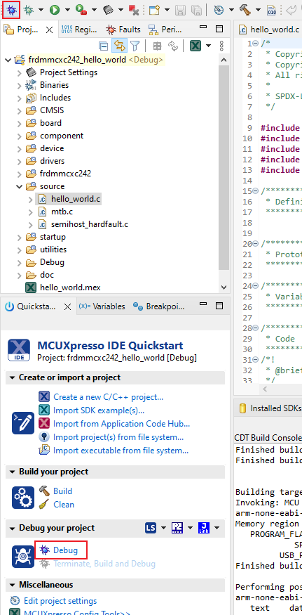 15. 画面上部の[Debug(デバッグ)]アイコンをクリックするか、「Quickstart Panel(クイックスタート・パネル)」の[Debug(デバッグ)]をクリックして、アプリケーションをボードにダウンロードします