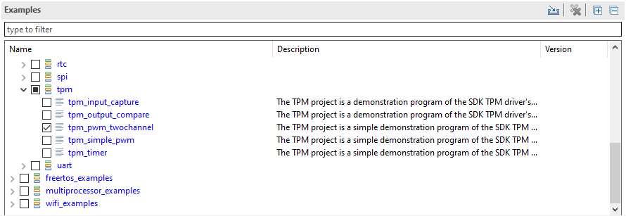 5. 矢印ボタンを使用してdriver_examplesカテゴリを展開し、次に[tpm examples(tpmサンプル)]を展開したら、frdmmcxc242_tpm_pwm_twochannelの横にあるチェックボックスをクリックしてサンプルを選択します。出力用にデフォルトのセミホスティングではなくUARTを使用するには、[Project Options(プロジェクト・オプション)]にある[SDK Debug Console(SDKデバッグ・コンソール)]のチェック・ボックスで[UART]を選択します
