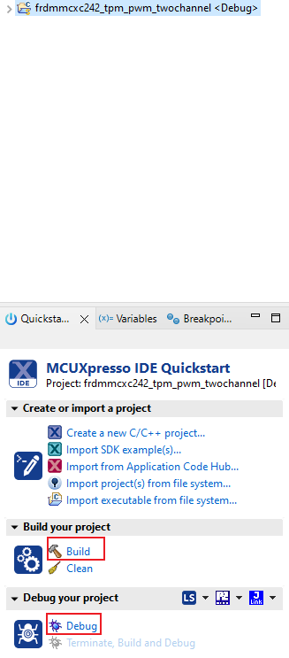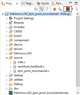 7. [Project Explorer(プロジェクト・エクスプローラ)]ビューで「frdmmcxc242_tpm_pwm_twochannel」プロジェクトをクリックし、前のセクションで行ったようにデモをビルド、コンパイル、および実行します