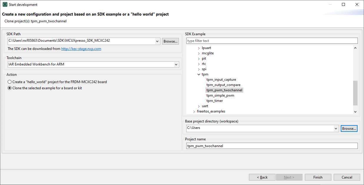 4. 次の画面で、MCUXpresso SDKの場所を選択します。SDKパッケージは事前に解凍しておく必要があります。次に、使用中のIDEを選択します。SDKのビルド時にはオンラインのSDKビルダで選択されたIDEのみが利用可能になることに注意してください。[clone select example(選択したサンプルのクローン)]をクリックします。次に、クローンを作成するプロジェクトを選択します。このサンプルでは、tpm_pwm_twochannelプロジェクトを使用します。フィルタのボックスに「tpm」と入力してプロジェクトを絞り込み、「tpm_pwm_twochannel」サンプル・プロジェクトを選択します。また、プロジェクトのクローンの作成先と名前を指定することもできます。その後、[Finish(完了)]をクリックします