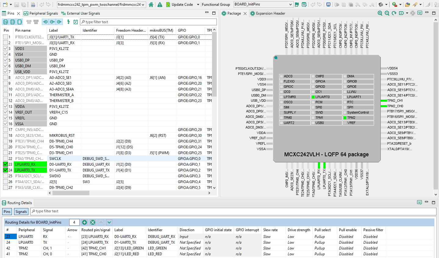 3. 現在の設定では、PTB18PTB19がTPMの出力としてルーティングされています。青色LEDを有効にするためにピン構成を追加しましょう