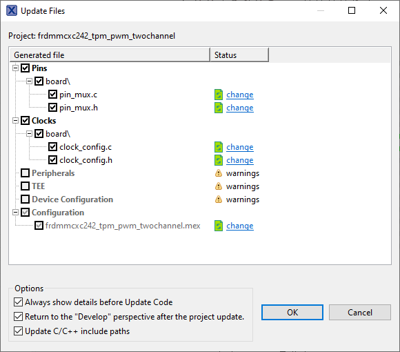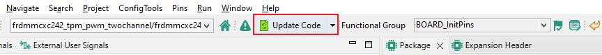 6. 次に、ピン・ツールによって生成された、新たに更新されたpin_mux.cファイルとpin_mux.hファイルをエクスポートして、これらの変更をプロジェクトに実装します。メニュー・バーの[Update Code(コードの更新)]をクリックします