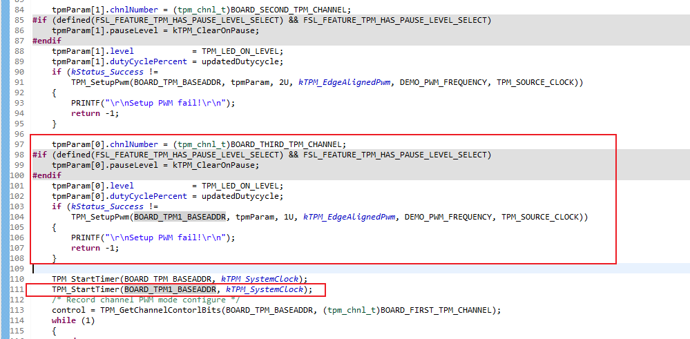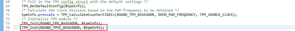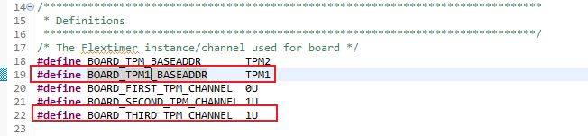 10. サンプルにいくつかのコードを追加してみましょう。tpm_pwm_twochannel.cファイルを開き、次のマクロを追加して青色LEDのTPMインスタンスおよびチャネルを追加します