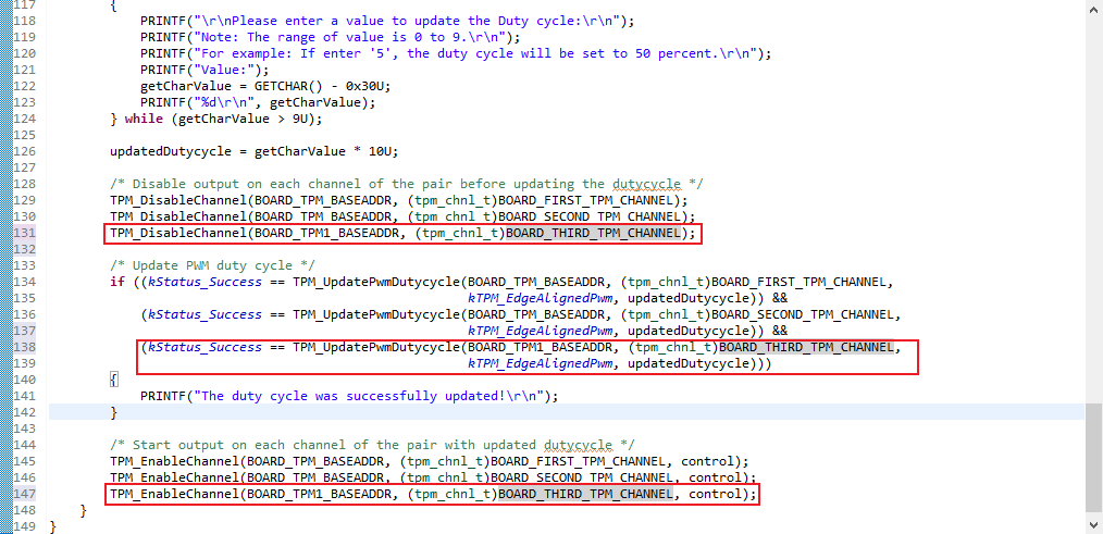 16. メイン関数の中のwhileループ内にTPM1_CH1制御関数を追加します