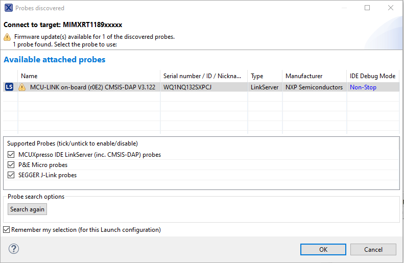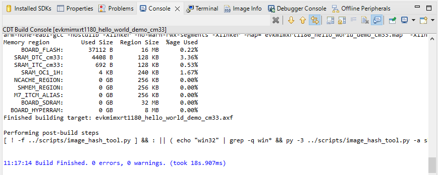 次の手順では、Cortex-M33アプリケーション向けにMCUXpresso IDEを使用したhello_worldデモ・アプリケーションについて説明します。MCUXpresso IDEのインストール手順およびi.MX RT1180シリーズのSDKについては、このスタート・ガイドの「ソフトウェアの入手」セクションを参照してください。MCUX IDEでは、CMSIS-DAPとJ-Linkの両方のデバッグ・インターフェースがサポートされています。CMSIS-DAPデバッグ・インターフェースを使用する場合は、SW5[1..4]を0100にする必要があります。J-Linkデバッグ・インターフェースを使用する場合は、SW5[1..4]を0001にする必要があります。
