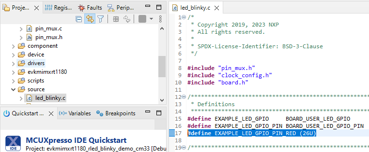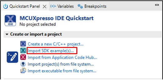 「SDKのサンプルのインポート」については、セクション 3.1を参照してください。このサンプルのクローンがスタンドアロン・プロジェクトとしてMCUXpresso IDEに作成されるため、コードを変更しても元のサンプル・ファイルには影響しません。