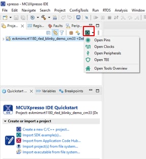 MCUXpresso Config Toolsは、ユーザーがMCUXpresso SDKプロジェクトを新規に作成するための構成ツールの統合スイートであり、カスタム・ボード・サポート用の初期化Cコードを生成するためのピンとクロックのツールも備えています。MCUXpresso IDEの一部として完全に統合されており、別のIDEを使用する場合は独立したツールとしても使用できます。