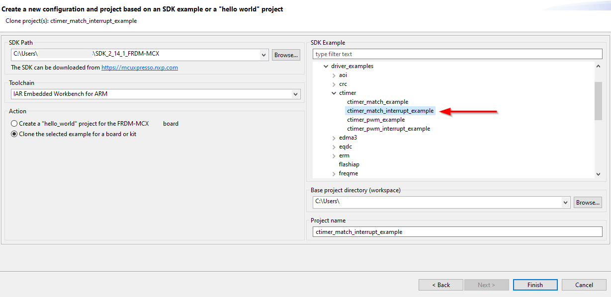 ctimer_match_interrupt_example」サンプル・プロジェクトを選択します。また、プロジェクトのクローンの作成先と名前を指定することもできます。[Finish(完了)]をクリックします