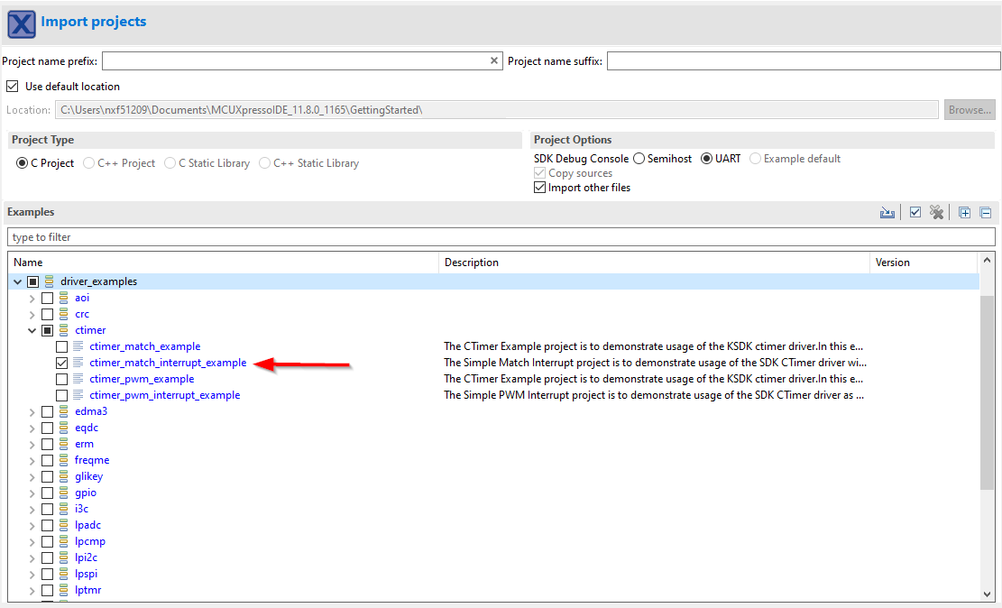 ctimer_match_interrupt_exampleの横にあるチェックボックスをクリックして選択状態にします。出力用にデフォルトのセミホスティングではなくUARTを使用するには、[Project Options(プロジェクト・オプション)]にある[SDK Debug Console(SDKデバッグ・コンソール)]のチェック・ボックスで[UART]を選択します。その後、[Finish(完了)]をクリックします