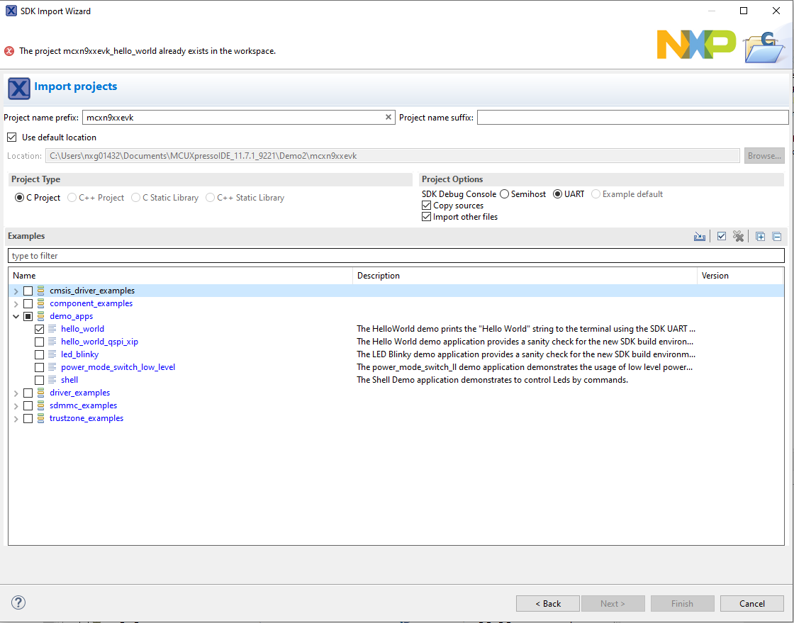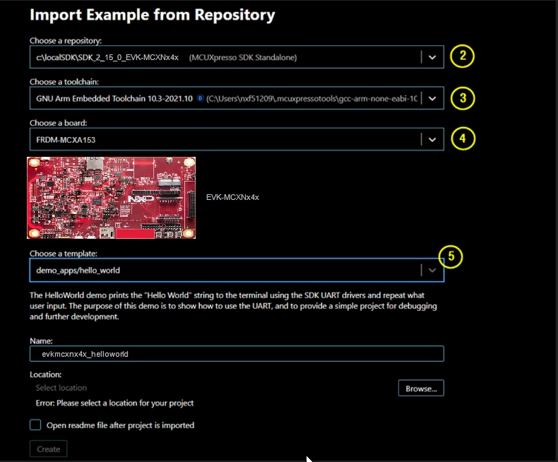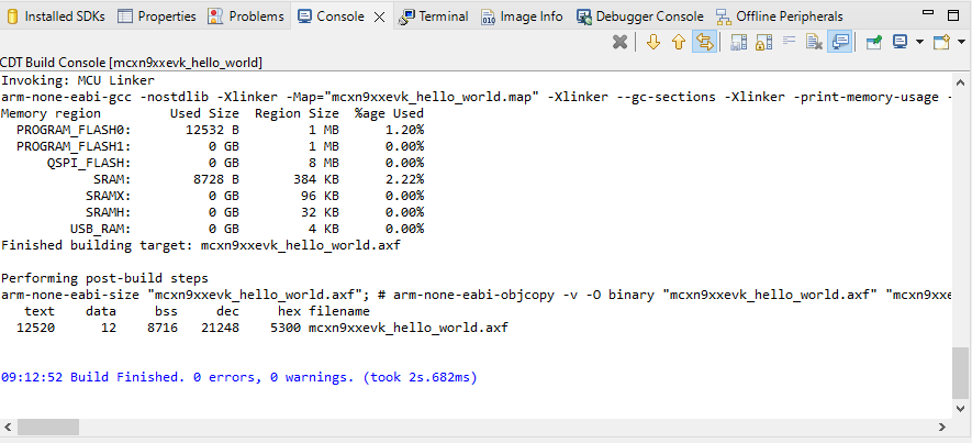 SDK_2_14_0_EVK-MCXN9xxを選択します 「gxx-arm-non-eabi-10.3」 オプションを選択します demo_apps/hello_worldを選択します