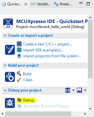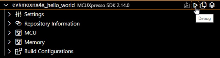 ビルドされたプロジェクトで出力されたバイナリは、デバッグ・セッションが起動する前にターゲット・ボードにフラッシュされます。デバッグ・セッションでは、開発者がプロジェクトの動作を分析するのに役立つコントロールとビューが提供されます。次の手順では、MCX N EVK評価キットを正常にフラッシュし、プログラムする方法を示します。