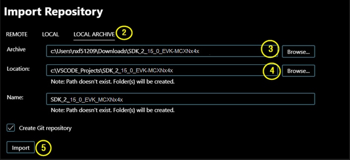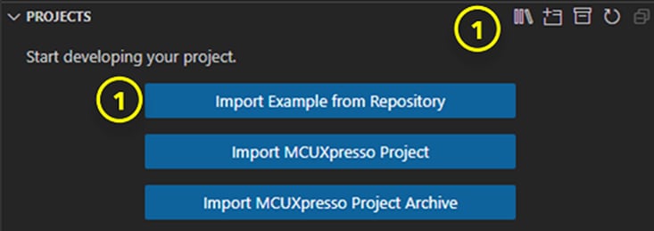 NXPの拡張機能により、開発者がプロジェクトをワークスペースにインポートできる「PROJECTS(プロジェクト)」ペインが用意されています。新しいプロジェクトは、リポジトリ、既存のローカル・プロジェクト、アーカイブされたプロジェクトの3つのソースからインポートすることができます。このセクションでは、先ほど「INSTALLED REPOSITORIES(インストールされたレポジトリ)」 パネルに追加したSDKからMCX Nのサンプルをインポートします。
