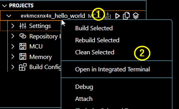「Hello World」 サンプルが「Projects(プロジェクト)」パネルに追加されますビルド・プロセスは、プロジェクトの作成時に構成されます。ユーザーは、[Project(プロジェクト)]ビューのアイコンを使用してビルドを開始できます。プロジェクト名の右側にあるビルド・アイコンをクリックすると、そのプロジェクトのビルドが開始されます。左側のナビゲーション・ペイン内の[X]アイコンをクリックして、MCUXpresso拡張機能の画面に戻る必要があります。前のセクションから、エクスプローラの画面のままになっているかもしれません。