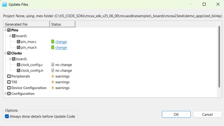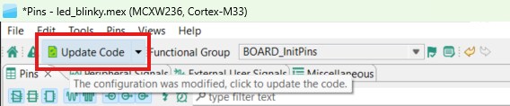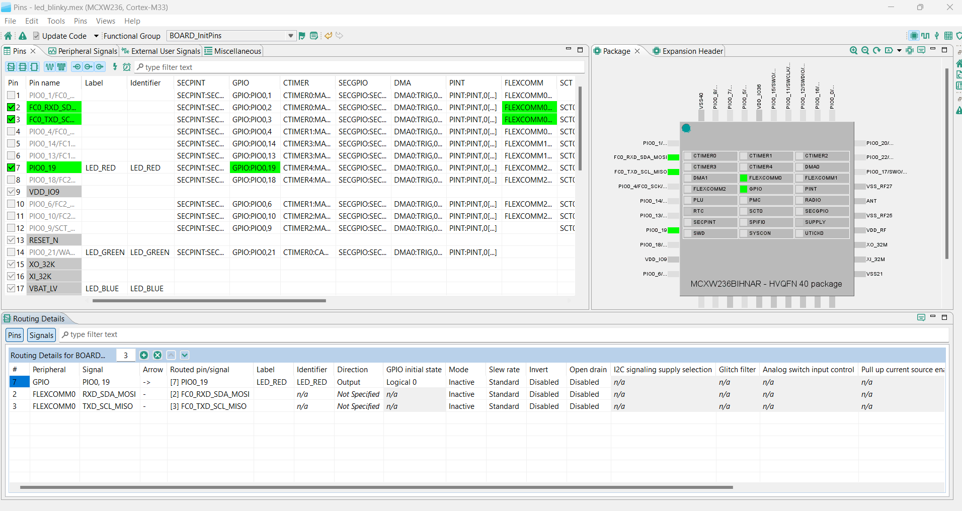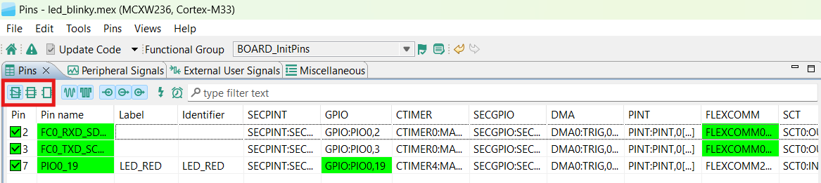 Note: If your imported example project does not have the .mex files present, please follow the [Working with MCUXpresso config tools guide]. The pins tool should now display the pin configuration for the led_blinky project