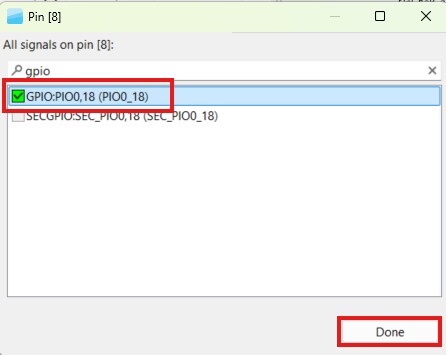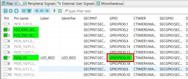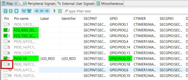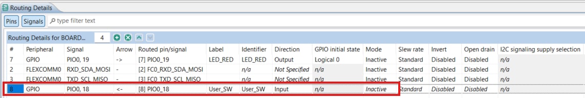 SW4 buttonSW4 button, search for PIO0_18 and click the checkbox under the PIN column to enable it