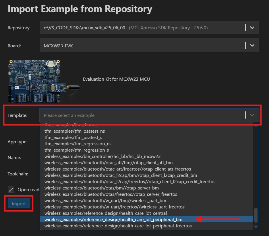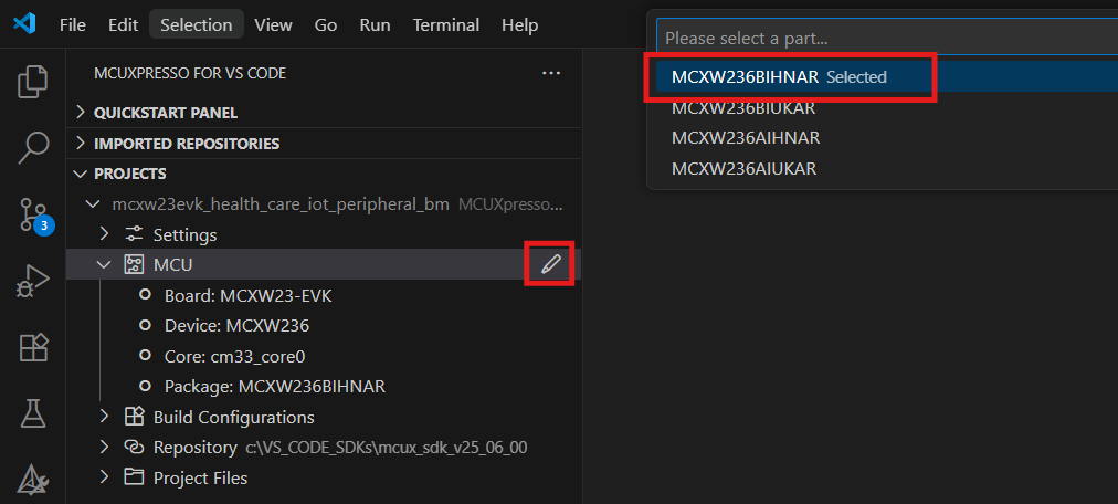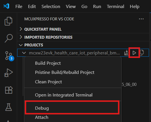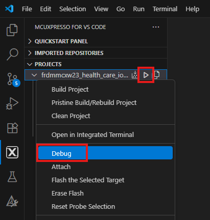 The following steps will guide you through the health care IoT demo application using MCUXpresso for vs code extension for the Cortex-M33 application. The MCUXpresso extension for vs code installation and the SDK for the MCXW-Series can be found at the Get Software section of this Getting Started guide.