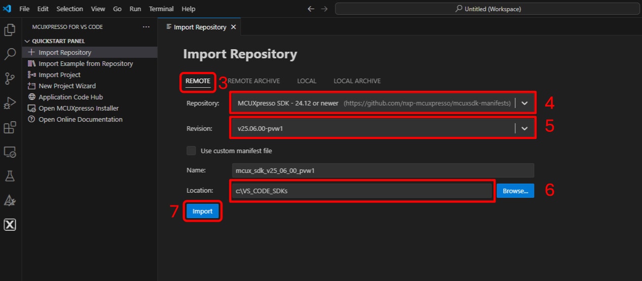 This section will import the MCUXpresso SDK using the remote git repository option. For the remote git repository option follow these steps.