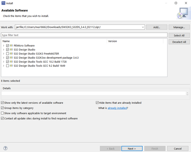 All the three SW above will be downloaded in the form of Update Sites for S32 Design Studio (.zip archives), which can be installed in S32 Design Studio by following these steps:
