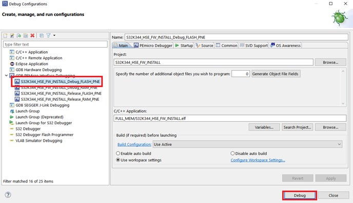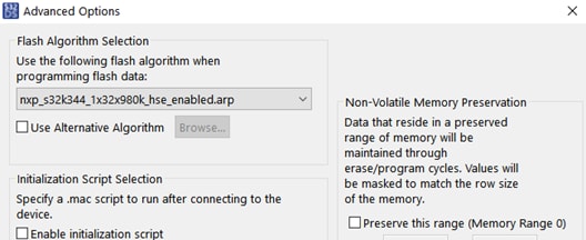 Note: The HSE firmware comes in two versions - Full memory and A/B Swap. NXP AWS IoT Core is using the A/B Swap version, although the Full memory version can also be used if OTA update feature is not needed. Please note that in case you want to use Full memory, the debug configuration of the demo applications must be updated to select the proper flashing algorithm, as depicted below: