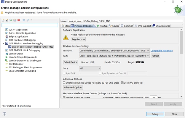 Click on the downward arrow corresponding to the Debug button in S32 DS and select Debug Configurations…. Select aws_mqtt_s32k344_Debug_FLASH_PNE and click on the Debug button.