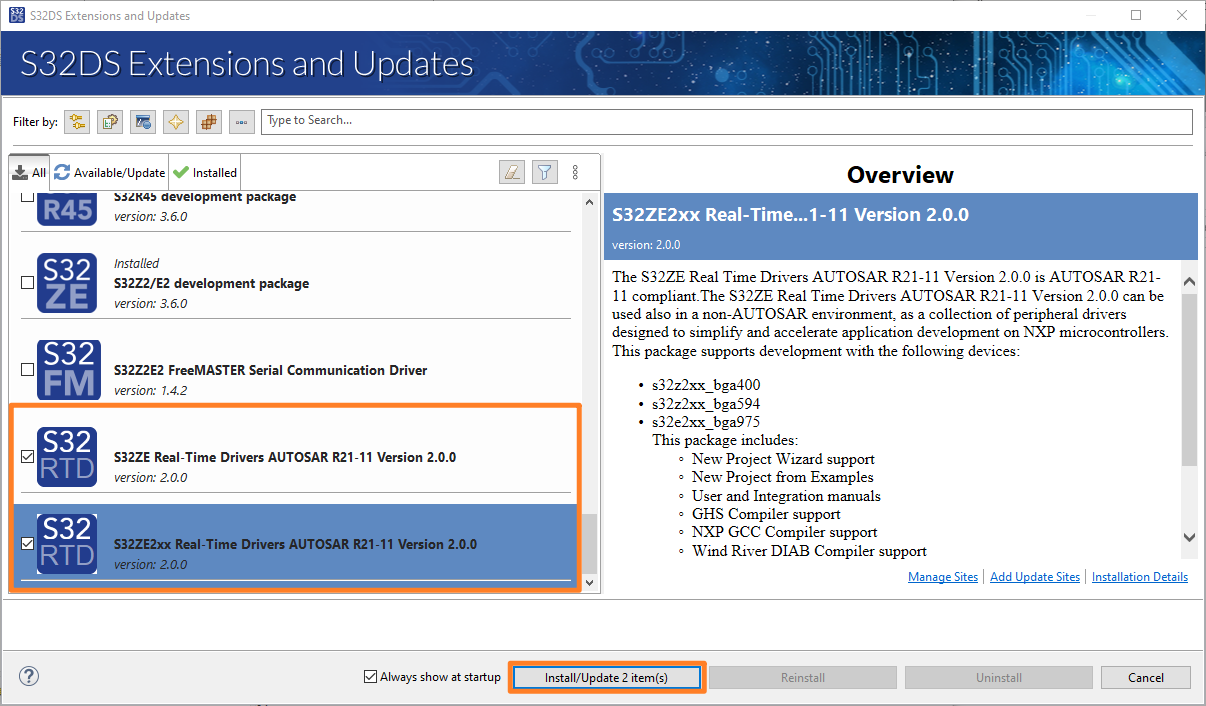 [S32DS Extensions and Updates(S32DSの拡張と更新)]ウィンドウのリストから2つのS32ZE Real-Time Drivers(S32ZEリアルタイム・ドライバ)オプションを見つけて選択し、[Install/Update(インストール/更新)]をクリックします。